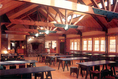 environment, and the huge fieldstone fireplace and "fan" trusses in the main