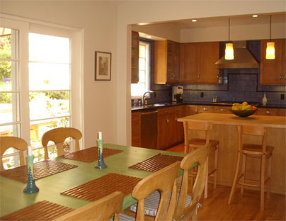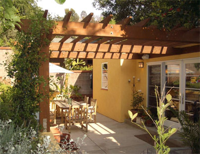 A modest addition to a classic 1920's Spanish-style hillside home provides a new Kitchen, Dining Room, third bedroom, bathroom, and pergola-covered patio.