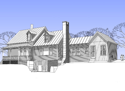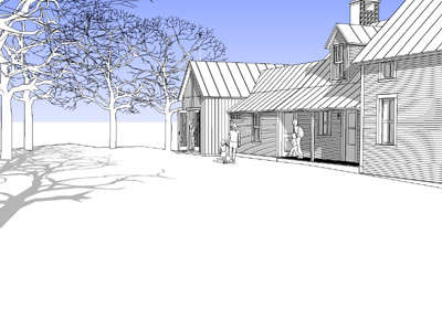 A new addition to a 19th century farm house will add a Mud Room, Bathroom, and Art Room. The new structure follows the New England vernacular tradition of "Big house, little house, back house, barn".