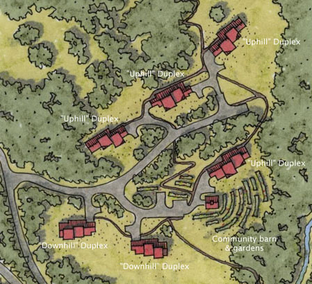 A close-up view of the village. There would have been six duplex units and the Community Building sited on three south-facing terraces. Because of the sloping site, all the homes would have had unobstructed views of an exquisite wooded river valley.